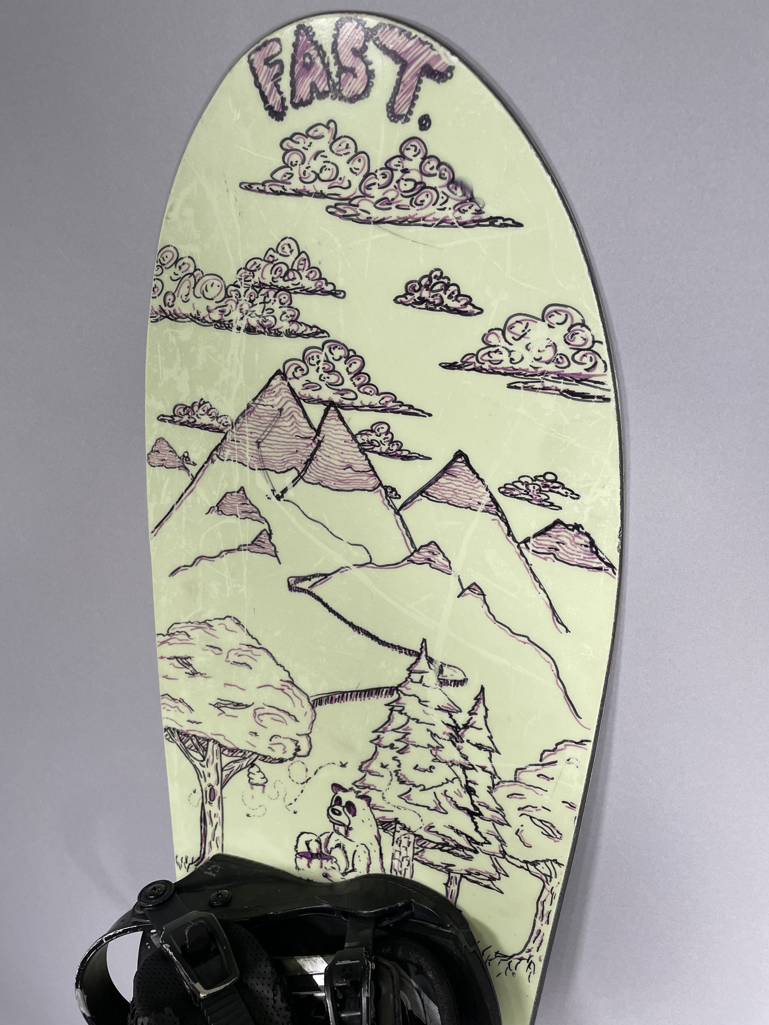 One of my favorite Activites when I have free time in the winter is snowboarding, in the past ive always drawn on my boards in there negative space to add my personal touch and to identify my board, as its common to get your board stolen but this has helped prevent stolen boards having a self drawn graphic. When in my foundations class freshman year, our final was a drawing or painting on any mixed media, I had just bought this blank Nitro snowboard and had the perfect opportunity for a project that I could enjoy during and after it was done. First-hand experience has taught me that the more I ride this board and people on the mountain see my work, I can get my name and product out for possible future commissioned work, whether that be on snowboards or skies.